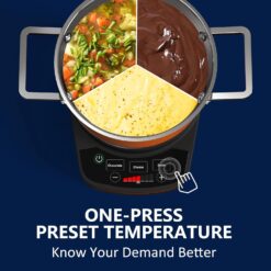 - Hassle-Free One-Click Preset – 3 preset modes set with one click of the button, our fondue pot electric set not just satisfy your love of chocolate, cheese and broth, the electric fondue set is also ideal for family gatherings, camping trips and picnics. The optimal temperature is a click away and everything is just right! Perfect for dipping bread, marshmallows, vegetables, fruit and more.