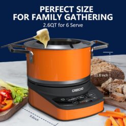 - House Warming Gifts New Home – The 2.6 Qt the fondue pot electric set has enough capacity for 6 people, which allows to make delicious fondue at home and embrace the joy of great cheese fondue pot, chocolate fondue pot & meat fondue pot. The electric fondue pot has a Vibrant orange look and quality packaged, which it’s the best way to bring the family to the table with our 2.6qt fondue pot set.