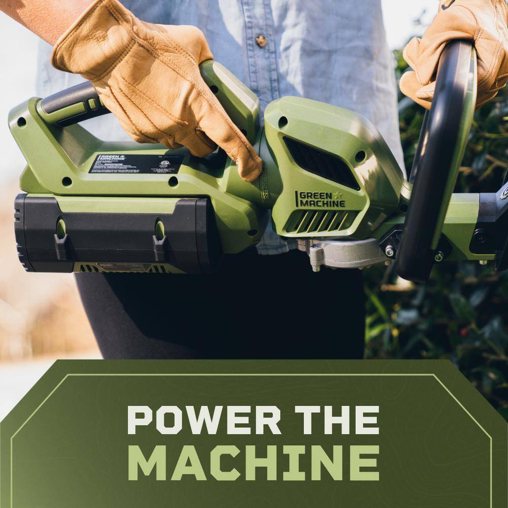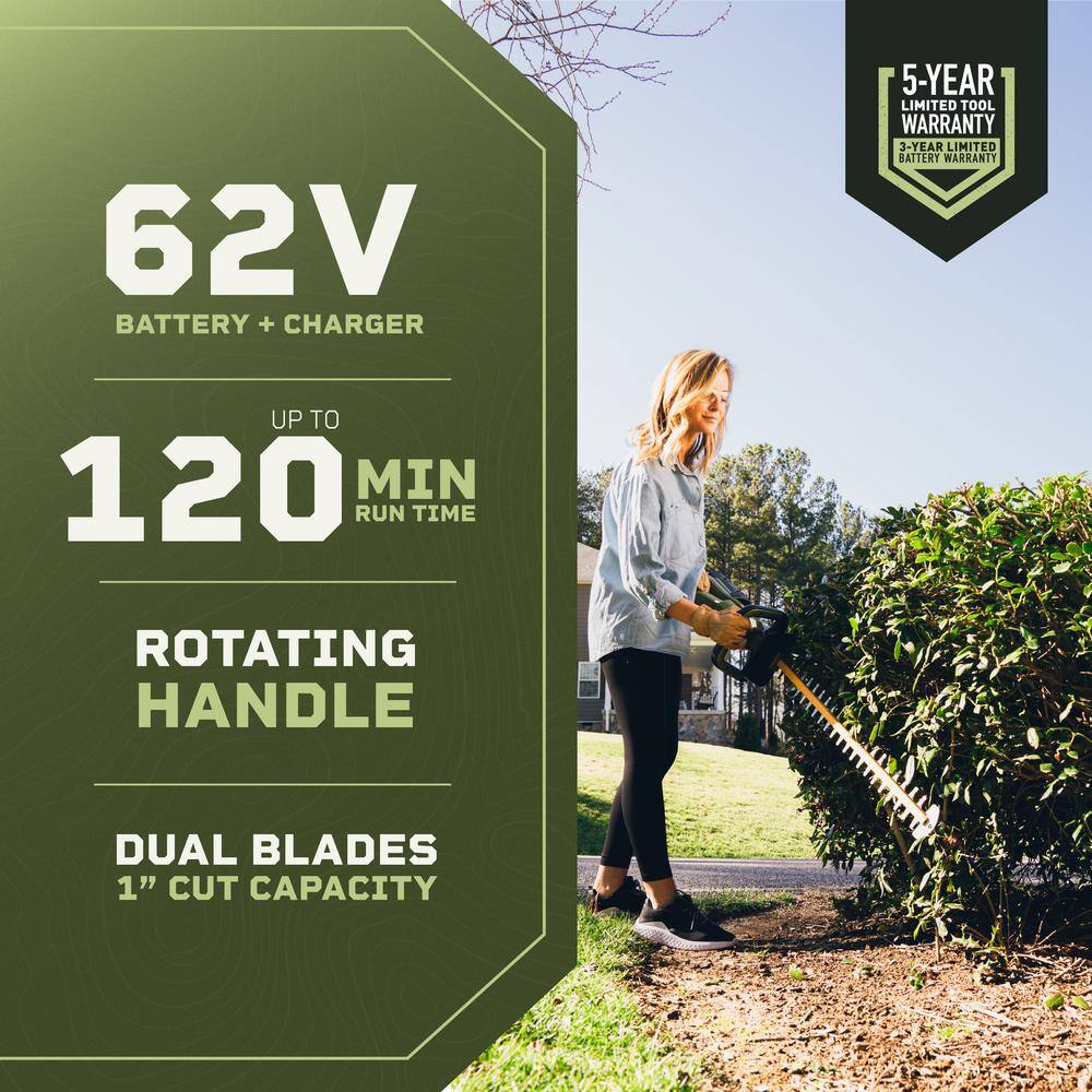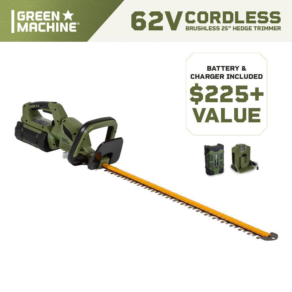 Green Machine GMHT6200 62V Brushless 25in. Cordless Battery Push start Hedge Trimmer with Rotating Handle and 2.5 Ah Batter and Rapid Charger