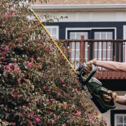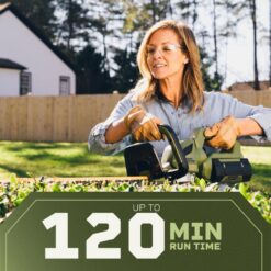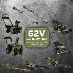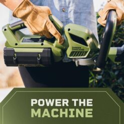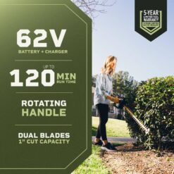 The Green Machine 62V Cordless Hedge Trimmer gives you powerful trimming with ease. It features a 1 in. cut capacity with the dual-action 25 in. cutting blade and a 62V 2.5 Ah battery and brushless motor for up to 120 minutes of run time. The rotating head has five positions for the perfect cut and it’s simple to start with just the press of a button.