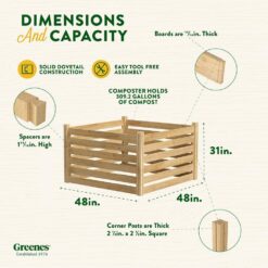 Create an environmentally friendly, economic composting system with Greenes Composting Bins. These cedar bins allow you to turn household waste into a natural food for your lawn, garden, and flower beds. Simply layer greens (such as vegetable and fruit peelings, coffee grounds, tea bags, and grass clippings) and browns (such as eggshells, cardboard, corncobs, and cotton towels) and allow materials to begin to compost. The bins’ open design makes it easy to turn the pile every 2-weeks to 3-weeks with a shovel or pitchfork to aerate the product and speed up the breakdown process. Depending on the climate and the mix of materials, your compost will be ready to use in 3-month to 12-months. To keep a continuous supply, create a multi-bin system with our add-on kits, after 1-bin is full and the materials have begun to break down, simply move them to the next bin and begin the process again in the first bin. A 3-bin system will keep the process moving seamlessly. Greenes composting bins are available in 48 in. x 48 in. x 31 in. 41.33 cu. ft. and include 4-posts, 24-boards, and 40-spacers. Cover with a tarp or plywood (not included) if desired.