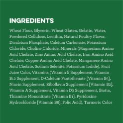 Wheat flour, glycerin, wheat gluten, gelatin, water, powdered cellulose, lecithin, minerals (dicalcium phosphate, potassium chloride, calcium carbonate, magnesium amino acid chelate, zinc amino acid chelate, iron amino acid chelate, copper amino acid chelate, manganese amino acid chelate, selenium, potassium iodide), natural poultry flavor, choline chloride, fruit juice color, vitamins ( dl-alpha tocopherol acetate [source of vitamin E], vitamin B12 supplement, d-calcium pantothenate [vitamin B5], niacin supplement, vitamin A supplement, riboflavin supplement [vitamin B2], vitamin D3 supplement, biotin, thiamine mononitrate [vitamin B1], pyridoxine hydrochloride [vitamin B6], folic acid), turmeric color.