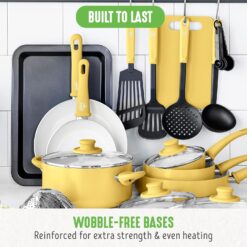 GreenLife Soft Grip Healthy Ceramic Nonstick 18 Piece Kitchen Cookware Pots and Frying Sauce Saute Pans Set, PFAS-Free with Kitchen Utensils and Lid, Dishwasher Safe, Yellow