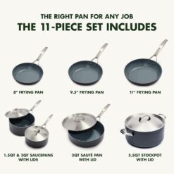 - Cookware Set Includes: 8″, 9.5″, and 11″ frypans; 1.5QT and 3QT saucepans with lids; 3QT sauté pan with lid; and 5.5QT stockpot with lid