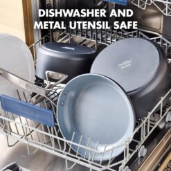 - Metal utensil safe, this collection’s diamond-reinforced coating is incredibly durable