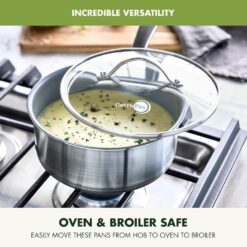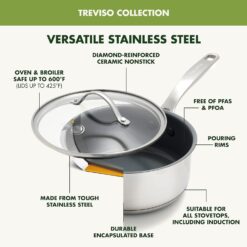 GreenPan Treviso Healthy Ceramic Nonstick 2.1QT Saucepan with Lid, PFOA-Free PFAS-Free, Stainless Steel Clad Cookware, Induction, Dishwasher Safe, Oven Safe, Even Heating, Silver