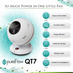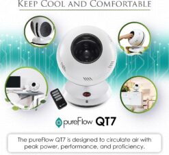 - Keep Yourself Cool and Comfortable: The pureFlow QT7 is an eye-catching fan uniquely designed to circulate air with peak power, performance, and proficiency. Its 90 degree vertical and horizontal oscillation circulates air throughout the entire room. The assembled product dimensions are 12.75” H x 10.50” W x 10.63” D, and the total weight is 6 lbs.
