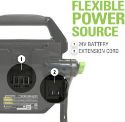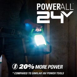 - Greenworks 24V (AC / DC) LED light can be powered with an extension cord or with a 24V battery – perfect for worksites and camping (battery charger sold separately)