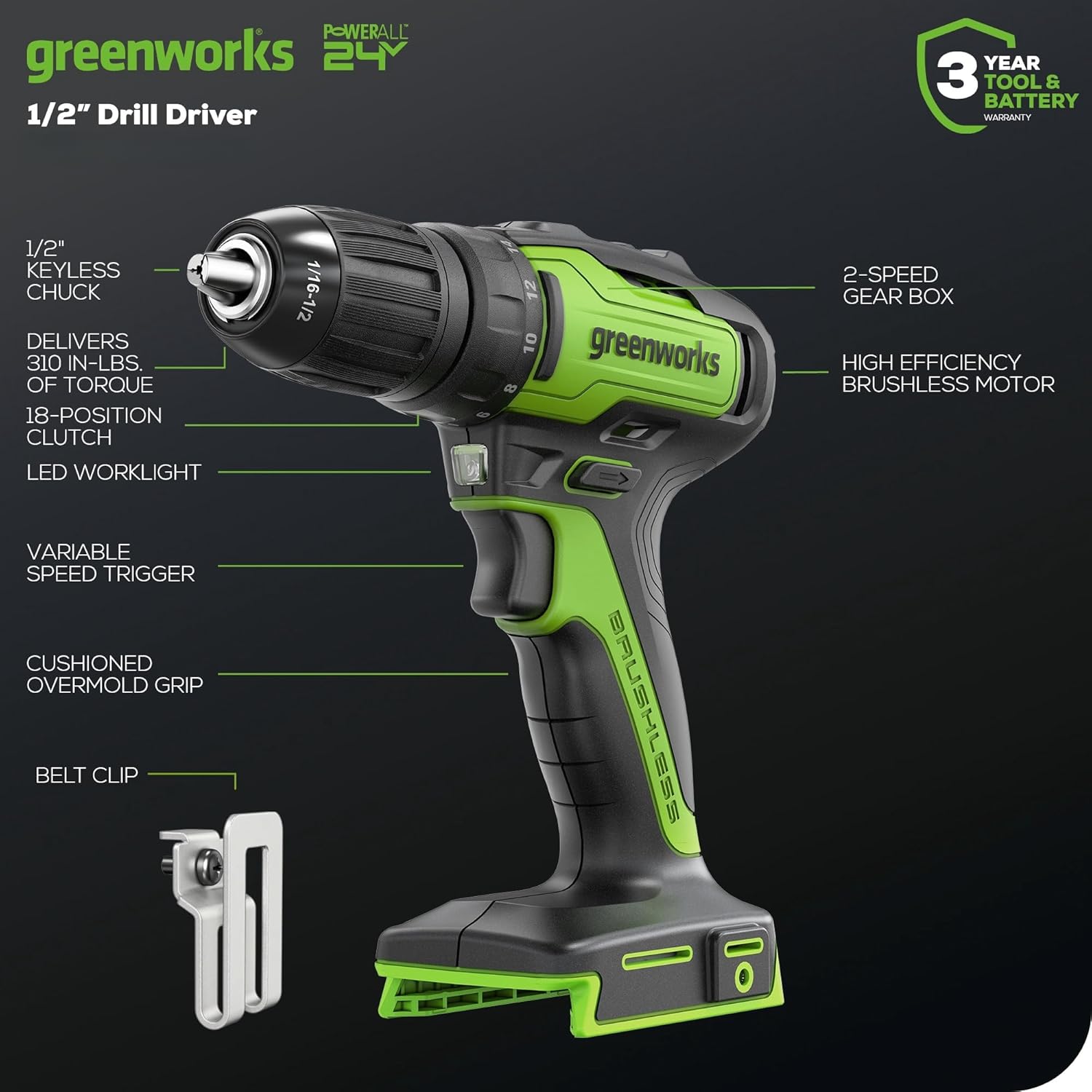 The Greenworks 24V Brushless Drill/Driver comes with (2) batteries and a charger. Though compact and lightweight, the drill has plenty of power for heavy-duty applications. The brushless motor delivers more power, longer run times, and extended motor life. With the flexibility of 18 torque settings, stripping screws can be a thing of the past. The Greenworks 24V lithium-ion platform powers over 50 indoor and outdoor products, including lawn mowers, blowers, string trimmers, chainsaws, power tools, and more! The 24V lithium-ion battery provides 20% more power and 35% more run time while delivering fade-free power with no memory loss after charging. The outdoor power equipment allows you to tackle up to 1/4 acre with the available 1.5Ah, 2Ah, and 4Ah batteries. USB ports are integrated into the BAG711, BAG708, and BAG709 batteries, making it a portable charger for phones, tablets, and other compatible electronic accessories. The Greenworks 24V platform comes with a 3-year tool/battery warranty to protect your investment.