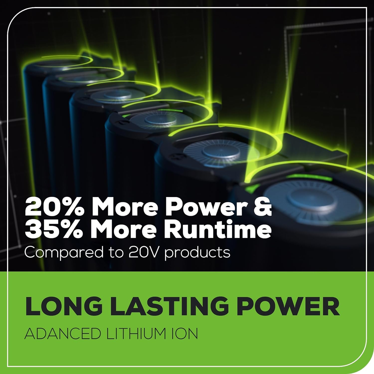 - 【Highly Efficient Brushless Motor & 2×1.5Ah Batteries】 delivers more power at 2X More Torque, cooler operation at high speeds, enhanced battery runtime and longer service life. 2×1.5Ah batteries can ensure that your Greenworks tool is always ready for use when you are.