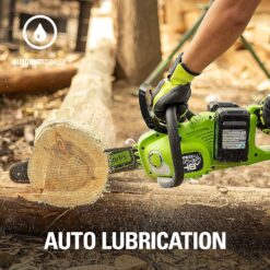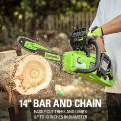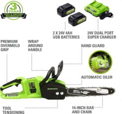 Greenworks 48V (2 x 24V) 14″ Brushless Cordless Chainsaw (Great For Tree Felling, Limbing, Pruning, and Firewood / 125+ Compatible Tools), (2) 4.0Ah Batteries and Dual Port Rapid Charger Included