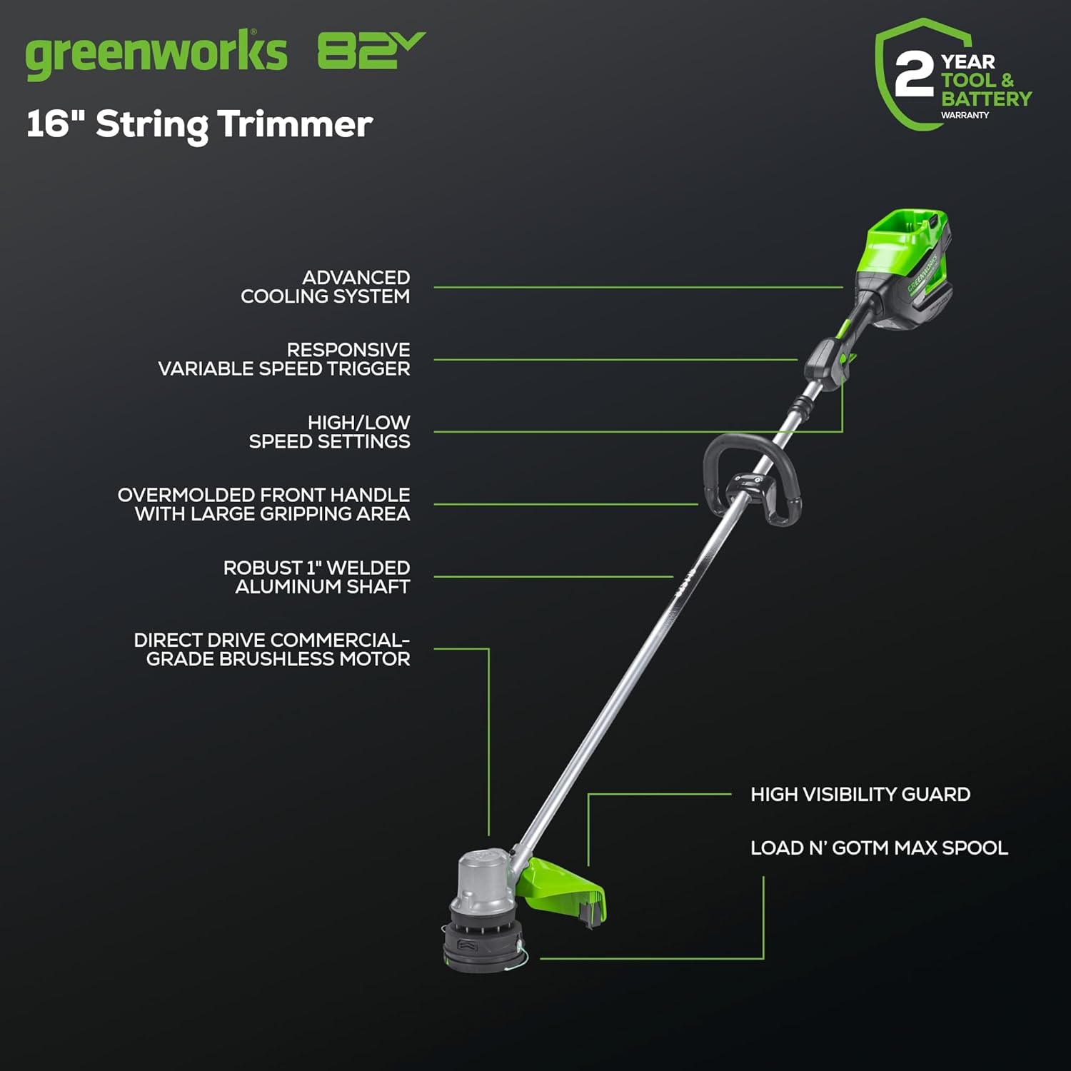 Greenworks 82ST151 82V 16″ (1.5kW) Brushless Cordless String Trimmer, 2.5Ah Battery and Dual Port Charger (Great for Landscapers and Professionals)