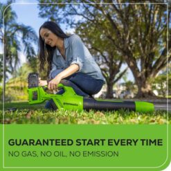 The Greenworks 2x24V (48V total power output) Cordless Battery Leaf Blower is designed for homeowners who demand both performance and convenience from their leaf blowers. With an impressive 585 CFM airflow, 140 MPH wind speed, and a quick 120-minute recharge time, yard maintenance can be done faster, easier, and with maximum power. Its lightweight (9.7 lbs) build ensures effortless maneuverability, taking on tough debris with ease, making it perfect for blowing large areas or tight corners. The variable speed trigger, coupled with cruise control, and concentrator nozzle makes clearing debris in corners / tight spaces a breeze, allows you to adjust airflow exactly where you need it, while the turbo button boosts power when you need an extra burst. Whether you’re clearing leaves from a driveway or debris from your backyard patio, this blower ensures you’re always in control. The included Greenworks 24V batteries power 125+ POWERALLâ„¢ 24V Greenworks products and all products in the POWERALLâ„¢ 24V platform come with a 3-year limited warranty. With its powerful performance and convenience, the Greenworks 585 CFM 140 MPH Cordless Battery Leaf Blower is the perfect addition to your lawn care collection.