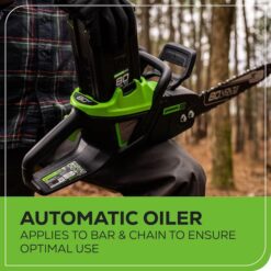 The Greenworks Pro 80V 18-in Battery-Powered Chainsaw is a game-changer in the outdoor power tools industry. Designed for professional users, DIY enthusiasts and homeowners, its powerful high-efficiency brushless motor provides 200 cuts on a single charge (with battery sold separately, 4×4 pressure treated lumber) and reaches max speeds of 13,000 RPM to deliver the cutting power equivalent to a 50-cc gas chainsaw. Our brushless chainsaw eliminates the hassle of gas purchases, priming, choking, pulling related gas-powered chainsaws and the energy consumption costs of corded electric chainsaws. Engineered to boost performance, ease of use and user comfort, our handheld chainsaw includes 2x more torque and power, a wrap-around handle that minimizes vibration, an easy two-step starting system for quick cuts, steel bucking spike for stability and automatic oiler system for continuous lubrication that extends the life of the chainsaw bar and chain. Weighing 20% less than gas chainsaws, it is easier to handle, reducing hand fatigue during extended use and is backed by our 4-year limited warranty and is powered by our 80V battery (chainsaw accessories: battery and charger not included) which powers 75+ Greenworks 80V products and outdoor power equipment. Make your wood cutting projects (tree logs, branches, trunks, lumber or other wooden materials) easy, eco-friendly and enjoyable with our Greenworks cordless chainsaw.