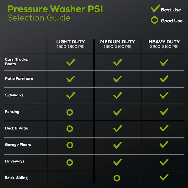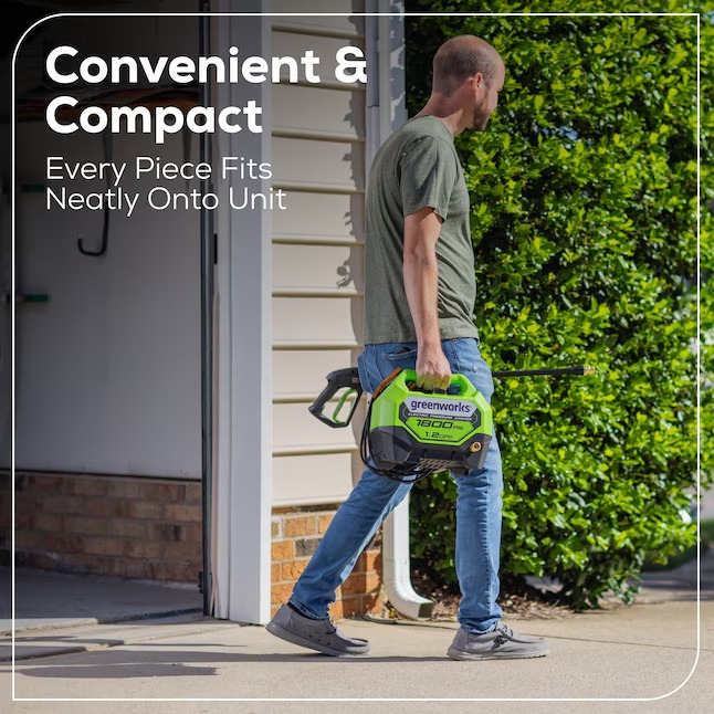 The Greenworks Pro 1800 PSI Pressure Washer is built to handle the toughest cleaning tasks, offering up to 1.2 GPM of water flow. With a convenient push-button start, it powers up effortlessly every time, getting to work quickly. It includes a Total Stop System (TSS) which prevents overheating by halting water flow and automatically shutting off the motor when the trigger is released. Features include a 35-ft power cord with GFCI and waterproof power plug, a 20-ft non-marring hose, and on-board storage for the four spray nozzles: Turbo, 25°, and 40°. Backed by an industry-best 3-year tool warranty, it’s built to stand up to most stubborn dirt and grime for years to come.