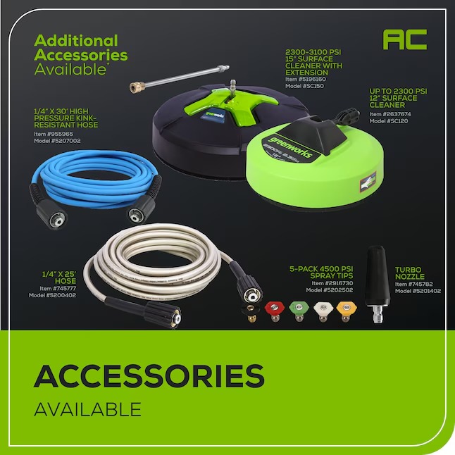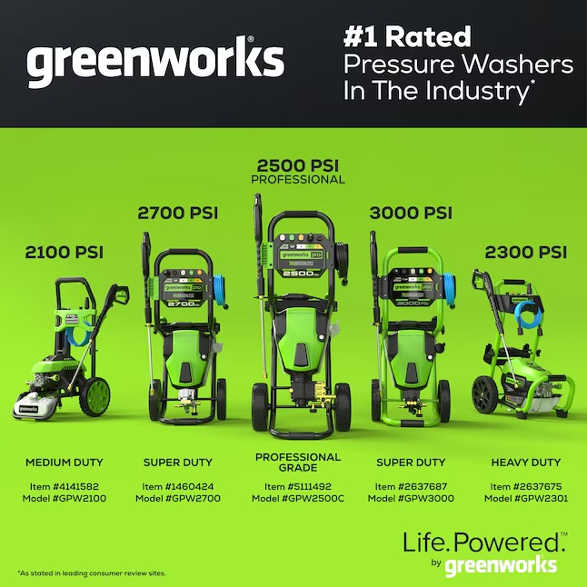The Greenworks Pro 2300 PSI pressure washer with Premium foam cannon kit is powerful and reliable, delivering 2.3 GPM Max of water flow. With a hassle-free push-button start, it powers up easily every time and gets to work fast. This unit features a Total Stop System. (TSS) senses water flow in the pump. When the trigger is released, water stops flowing through the pump. The TSS then automatically turns the motor off to protect the pump from overheating. Innovative Greenworks TruBrushless™ motor technology automatically adapts motor power for maximum cleaning power with any nozzle. It’s equipped with extra-long 35-ft power cord with in-line GFCI and waterproof power plug, 25-ft kink-resistant hose that eliminates frustrating hose tangles, 10-in never-flat wheels for easy transportation, on-board soap tank, premium foam cannon and on-board accessory storage for the (5) spray nozzles – Turbo, Soap, 15°, 25° and 40°. Backed by an industry-best 10-year motor warranty and 3-year tool warranty, it’s built to stand up to most stubborn dirt and grime for years to come.
