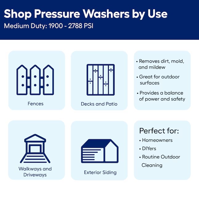 - Power: Powerful residential electric pressure washer with 2300 MAX PSI, 2.3 MAX GPM (GPM ranges from 1.2 GPM to 2.3 GPM with included nozzles)