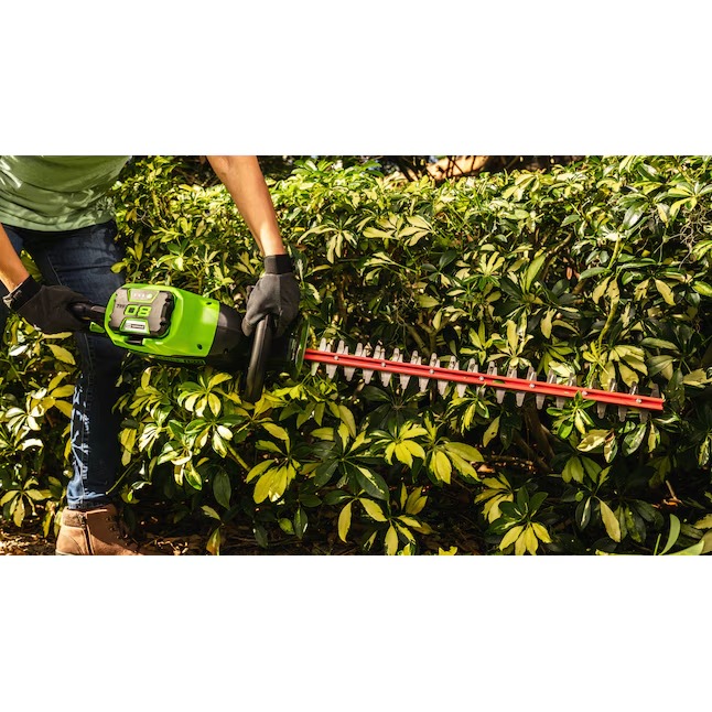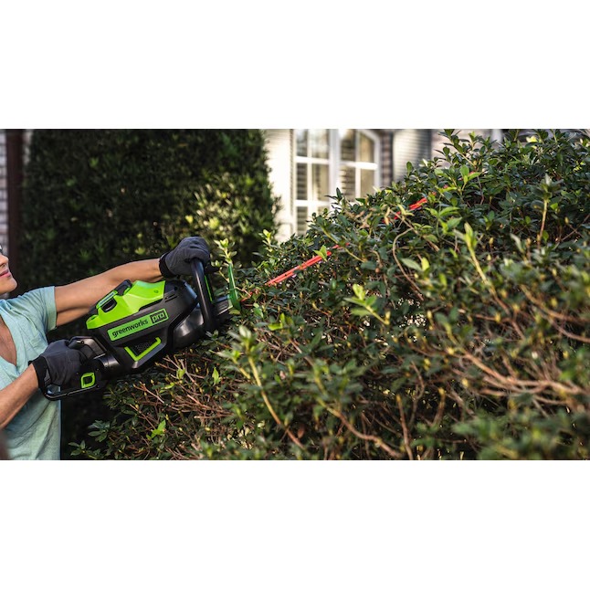 The Greenworks Pro 80V 26-in Hedge Trimmer provides best in class cutting performance, with 26-in dual action, laser cut, steel blades. This unit has a cutting speed of 3,200 strokes per minute for a faster, more efficient cut, leaving you with impressive results every time. The intelligent brushless motor maximizes efficiency by providing more power, torque, and longer life and the 180°rotating rear handle allows for precision cutting at any angle. Features an easy trigger start, lightweight design, and over-molded wrap-around handle for optimal comfort and control. Battery and charger sold separately. 4-year limited warranty.