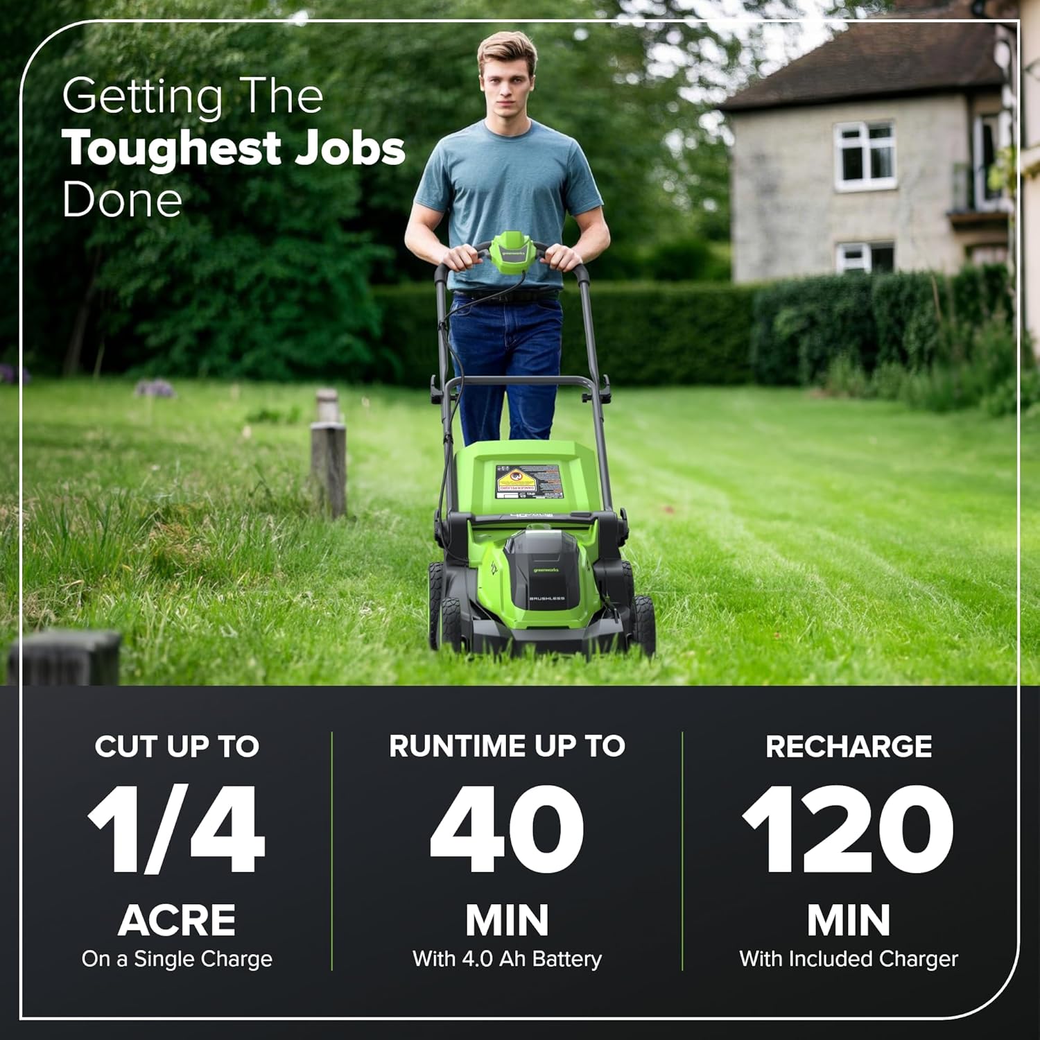 - CORDLESS LAWN MOWER – Get more done, faster, with Greenworks electric lawn mowers. This 40V push lawn mower provides the power you need with up to 35 minutes of runtime on a fully charged 4.0Ah battery