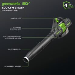 Greenworks Pro BL80B210 80-volt Max 500-CFM 150-MPH Battery Handheld Leaf Blower 2 Ah (Battery and Charger Included)