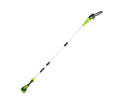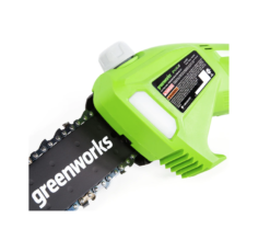 This Greenworks 24V battery powered polesaw features an 8-in. bar and chain (.050 gauge, 33 drive links, 3/8-in. LP low kickback chain), automatic oiler, cushioned overmold grip, aluminum shaft, and manual chain tensioning.