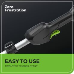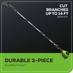 The Greenworks 80V 10-in Battery-Powered Pole Saw is an outdoor power tool designed for professional users, DIY enthusiasts, and homeowners to elevate outdoor spaces, improve yard maintenance or cleanup after a storm. Its 10-inch bar, ¼-in chain, 11-FT max extension and powerful brushless motor combine to cut, trim and prune tree branches, limbs, lumber, hedges, and shrub barks in hard-to-reach places (up to 83 cuts on a single charge; 4×4 pressure treated lumber). Our pole saw eliminates the inconvenience of gas purchases, priming, choking, pulling related gas-powered saws and the energy consumption expenses of corded electric pole saws. Engineered to boost performance, ease of use and user comfort, our handheld pole saw includes 2x more torque and power, a cushioned overmold grip that minimizes vibration and improves user comfort, an easy push-button start system for quick cuts and automatic chain oiler for continuous lubrication that extends the life of the pole saw bar and chain. With its lightweight design, it is easy to use and handle, reducing hand fatigue during extended use. It is backed by a 4-year limited warranty and is powered by our 80V battery (pole saw accessories: battery and charger included) which powers 75+ Greenworks 80V products and outdoor power equipment. Make your cutting, trimming and pruning projects simple, easy and enjoyable with our Greenworks cordless pole saw.