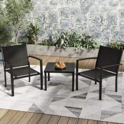 Greesum 3 Pieces Patio Furniture Set Outdoor Conversation Textilene Fabric Chairs for Lawn, Garden, Balcony, Poolside with A Glass Coffee Table, Black