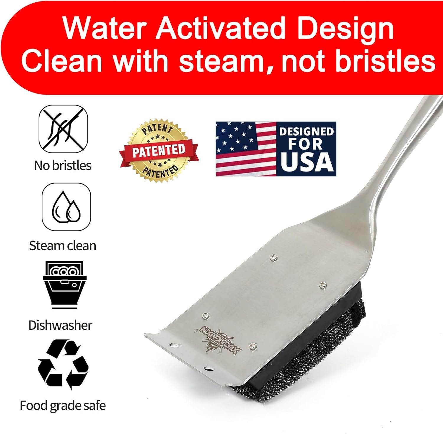 - 【Safest Steam Brush】With a bristle-free grill brush. you don’t have to worry about dangerous wire bristles found on most common barbeque brush products. Water activated design cleans with the power of steam thanks to a core made of XUDAKAIXIN exclusive foam.(𝐏𝐚𝐭𝐞𝐧𝐭𝐞𝐝 𝐃𝐞𝐬𝐢𝐠𝐧)Cleaning your grill only takes about five seconds.