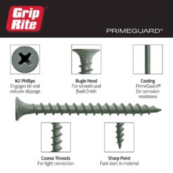 Grip-Rite PTN310B PrimeGuard #9 x 3 in. #2 Phillips Bugle Head Coarse Thread Coated Exterior Screws feature a sharp point and 10-year coating for quality and value. Designed for exterior, wood to wood applications, the coarse threads reduce splitting and speed installation. Backed by a limited lifetime warranty, these screws are perfect for your weekend DIY projects.