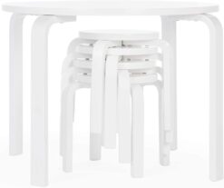 Ideal for a play room or a family room, the Nordic Table & Stool Set features a modern design with classic styling. Crafted of birch, the design features natural bentwood contours and smooth edges that offer the space and comfort to create, snack, read, and more. The set includes a table and four stackable stools. Store the stools beneath the table when not in use. Adult assembly required.