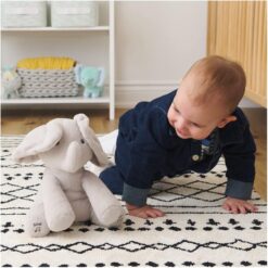 Flappy, the one and only animated Elephant is always ready to play with baby – and now he’s even better than ever! The official animated Flappy the Elephant plush by Baby GUND is an adorable singing elephant with two different play modes that entertain baby. Press Flappy’s left foot to engage him in an interactive game of peek-a-boo, where Flappy hides behind his soft, oversized ears. Press his right foot to sing along to a playful new song in a cute child’s voice, while his ears flap in time to the rhythm! Flappy also now features volume control for a more customized play session. Users can adjust volumes by holding either foot for three seconds. Song styles may vary. This infant plush toy has baby-safe embroidered details, super-soft limbs, and a huggable body that is safe for all ages and ready to be baby’s best friend from the start! This adorable Baby GUND plush elephant is surface-washable for easy cleaning and appropriate for children 0 months and up.