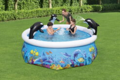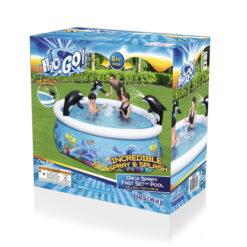 The H2OGO Orca Spray Pool is a fun twist on the traditional Bestway Fast Set pool that promises a great time for the whole family From the box to the yard, setting up this pool only takes 10 minutes. Simple choose a flat, level surface, inflate the top ring, and watch the pool rise as it’s filled with water. The Orca Spray Pool features three inflatable whales, two of which have built-in sprayers for an incredible time splashing in the water. This pool also features our Tritech liner, an extra durable and puncture-resistant material so the fun can last all summer long. You and your kids are sure to have a whaley great summer with the H2OGO! Orca Inflatable Spray Pool.
