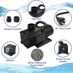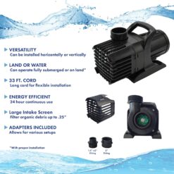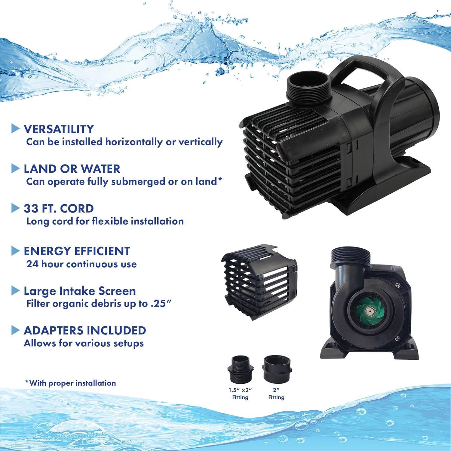 - Industry-Leading Flow & Versatility: Features a deep-vein, replaceable impeller that delivers maximum water flow at greater head heights. This energy-efficient pond pump is designed for both submersible and in-line use, making it ideal for waterfalls, koi ponds, and larger water features.