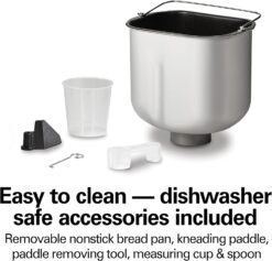 - EASY TO CLEAN. Comes with removable nonstick bread pan, kneading paddle, paddle removing tool, measuring cup and spoon for fast, easy cleanup after baking.
