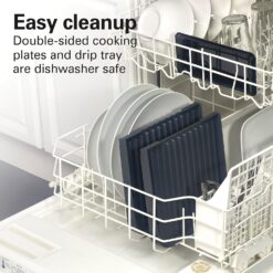 - EASY CLEANUP: The double-sided cooking plates are dishwasher safe and the drip tray can go in the top-rack of the dishwasher.