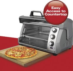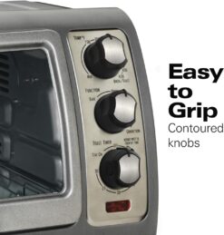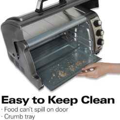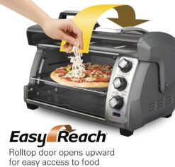 You won’t find a design like the Hamilton Beach easy reach toaster oven with roll-top door anywhere else. Its unique and large opening makes food easy to reach. And since the door opens above the oven, it frees up your countertop space in front. Best of all, it’s easy to keep clean because food can’t spill on the door. Contoured dials are easy to grip and turn, making it simple to switch between bake, broil and toast settings. The stay-on setting is safer thanks to a stop mechanism that prevents the knob from being turned to stay-on by accident. Care – This appliance is not intended for use by persons (including children) with reduced physical, sensory, or mental capabilities, or lack of experience and knowledge, unless they are closely supervised and instructed concerning use of the appliance by a person responsible for their safety. Close supervision is necessary when any appliance is used by or near children. Children should be supervised to ensure that they do not play with the appliance. Do not touch hot surfaces. Use handles or knobs. To protect against electric shock, do not immerse cord, plug, or toaster oven in water or other liquid. Unplug from outlet when not in use and before cleaning. Allow to cool before cleaning appliance and putting on or taking off parts. Do not operate any appliance with a damaged supply cord or plug, or after the appliance malfunctions or has been dropped or damaged in any manner. Supply cord replacement and repairs must be conducted by the manufacturer, its service agent, or similarly qualified persons in order to avoid a hazard. Call the provided customer service number for information on examination, repair, or adjustment. The use of accessory attachments not recommended by the appliance manufacturer may cause injuries. Do not use outdoors. Do not let cord hang over edge of table or counter or touch hot surfaces. Do not place on or near a hot gas or electric burner or in a heated oven. Extreme caution must be used when moving an appliance containing hot oil or other hot liquids. Use extreme caution when removing pan or disposing of hot grease. Do not clean with metal scouring pads. Pieces can break off the pad and touch electrical parts, creating a risk of electrical shock. Oversize foods or metal utensils must not be inserted in a toaster oven as they may create a fire or risk of electric shock.