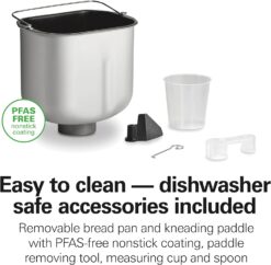 - EASY TO CLEAN: DISHWASHER SAFE ACCESSORIES. Comes with a removable bread pan and kneading paddle with PFAS-free nonstick coating, paddle removing tool, measuring cup and a spoon for fast, easy cleanup after baking.