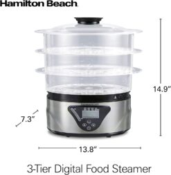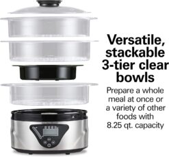 Hamilton Beach Digital Electric Food Steamer & Rice Cooker for Quick, Healthy Cooking with Stackable Three-Tier Bowls for Vegetables and Seafood, 8.25 Quart, Black & Stainless Steel