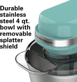 Hamilton Beach Electric Stand Mixer, 4 Quarts, Dough Hook, Flat Beater Attachments, Splash Guard 7 Speeds with Whisk, Aqua