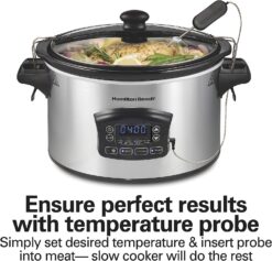 - ENSURE PERFECT RESULTS WITH TEMPERATURE PROBE: Cook meat to a precise temperature without overcooking it. Set this programmable slow cooker to the desired temperature, insert probe and it will automatically shift to warm when food is ready.