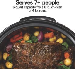 - SERVES 7+ PEOPLE WITH 6 QUART CAPACITY: This 6 quart slow cooker’s size is perfect for preparing one-pot dishes, family meals or crowd-pleasing appetizers and it fits a 6 lb. chicken or 4 lb. roast.