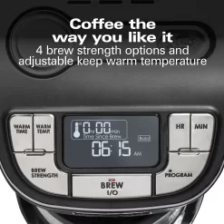 Enjoy perfect coffee every time with the Hamilton Beach Professional Programmable Coffee Maker. It has high-performance brewing to fully extract coffee’s rich, balanced flavor. The high brewing temperature, oversized showerhead and cone brew basket evenly saturate coffee and provide optimal extraction. The removable 60-oz. water reservoir and swing-open cone brew basket make filling easy.