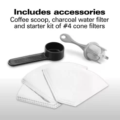 You can wake up to hot coffee with the 24-hour advance brew start, which lets you program a fully automatic morning cup. The drip-free carafe with an ergonomic handle provides comfortable, mess-free pouring. You can customize your coffee with 4-brew strength options and the adjustable keep warm temperature. The “time since brew” freshness indicator and cleaning cycle reminder help you consistently achieve fresh-tasting coffee, and the auto-shutoff time is adjustable. The sleek, brushed-metal design of this coffee maker looks great in every kitchen. Accessories include a coffee scoop, water filter and starter kit of #4 cone filters. Comes with a 5-year limited warranty.