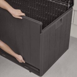 Keep summer fun items close by in this amazing deck box. It features a lovely java brown hue on its wood-like sides, making this box a stylish addition on a patio, deck or porch. Large interior cabinet is perfect for storing outdoor pillows, seat pads, swim gear and more.
