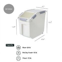 - 10 Liter-9.7″Wx15.6″Dx10.3″H, holds approximately 20 lbs of rice or 10 lbs of pet dry food.