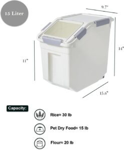 - 15 Liter-9.7″Wx15.6″Dx14″H, holds approximately 30 lbs of rice or 15 lbs of pet dry food.