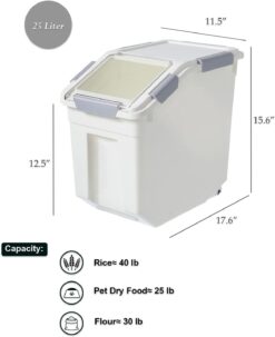 - 25 Liter-11.5″Wx17.6″Dx15.6″H, holds approximately 40 lbs of rice or 27 lbs of pet dry food.