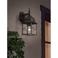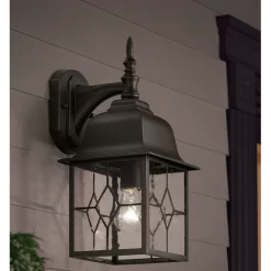 Harbor Breeze Litshire 15.62-in H oil-rubbed bronze outdoor wall light is a die-cast aluminum fixture with clear seeded and water glass, and is weather-resistant and sturdy. The traditional design has a diamond glass pattern that mixes the clear seeded and water glass which completes the elegant detail. This is the perfect fixture for mounting on the sides of your exterior doors, or next to your garage and is damp rated. It requires one 100 watt medium base A19 bulb (not included), and it is compatible with dimmable circuits when used with a dimmable bulb. UL listing demonstrates this product has met minimum requirements of the widely accepted product safety standards. Don’t forget to look for the other Litshire collection lighting fixtures to compliment your new outdoor wall mount fixture.