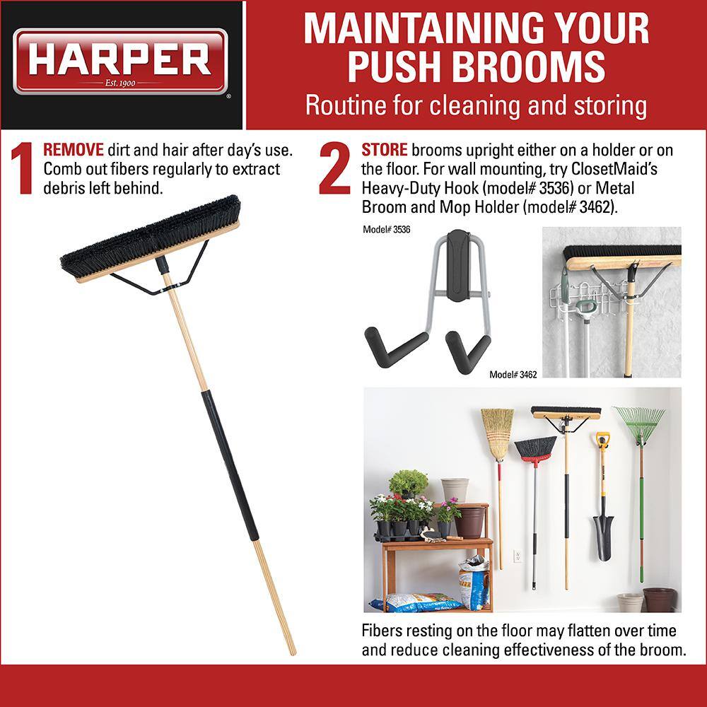Harper has been perfecting the art of high-quality broom manufacturing since 1900 and this smooth surface, indoor broom is a great example of that. The Harper 24 in. Indoor Smooth-Surface Hardwood/Steel Handle Push Broom features fine bristles with soft, split-tip ends to pick up and move lightweight debris, like dust, effectively and efficiently. The never-loose bolt-on connector and steel brace are durable and provide for best sweeping power. Plus, the new patent pending handle combines wood and steel with an oversized comfort grip for durability and comfort. with a 1-time, easy assembly, the handle and broom will stay strong to not twist or loosen. This 24 in. Push Broom with a non-warping maple brush head offers long-lasting quality and efficiency.