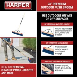 Harper has been perfecting the art of high-quality broom manufacturing since 1900 and this rough- surface, outdoor broom is a great example of that. The Harper 24 in. Premium Outdoor Wet/Dry Rough-Surface Hardwood/Steel Handle Push Broom features stiff sweeping synthetic bristles for maximum cleaning power on rough surfaces. The never-loose bolt-on connector and steel brace are durable and provide for best sweeping power. Plus, the new patent pending handle combines wood and steel with an oversized comfort grip for durability and comfort. with a 1-time, easy assembly, the handle and broom will stay strong to not twist or loosen. This 24 in. Push Broom with a non-warping maple brush head offers long-lasting quality and efficiency.
